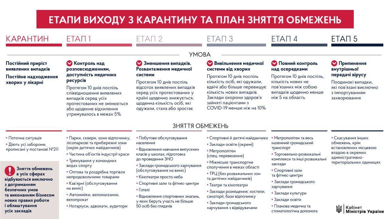 Кабинет министров разработал четкий план выхода из карантина, который состоит из 5 этапов.